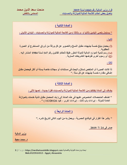 قرار وزير المالية رقم (464) لسنة 2019 بتعديل بعض أحكام اللائحة المالية للموازنة والحسابات المعتمدة بقرار وزير المالية رقم (638) لسنة 2012